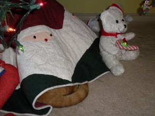 I am showing you a picture of our Christmas tree that our girls assembled almost entirely by themselves. The bottom branches are extremely low, courtesy of our two cats (tree-climbers), Aslan and Lucy. And if you wonder why the tree isn’t lying on the floor, that is courtesy of my husband who made a cement block years ago to maintain the tree (the tree pole is “stuck” in the middle of that cement block). The cement is sturdy and keeps the tree upright, regardless of the critter that ventures to climb it. The limbs may sag, but that tree is not going anywhere. We desperately need a new tree, as this one is fairly old, but we are sentimental souls. The girls have been leaving their marks with colors on the Christmas tree box since they were babies. By the way, do you see the kittie under the tree posing as a Christmas gift (in picture to the right)?