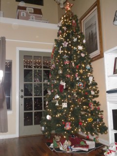 This leads me to another item we need to part with – our old Christmas tree. I don’t remember the year we bought it, but it has to be over 15 years old. The layout of our “little house on a county road” is very different than we’ve previously had, and there just isn’t room for that broad tree! So, we had to buy a new “slim” tree. I really love it though. Our old one was 7.5 feet; and our new one is 9 feet. That extra height is glorious. We had to place it in our entry way … leaving just enough room to open the front door … there simply was no other place. But it is so pretty there, and the lights on it shine through the front door at night. Makes me smile.