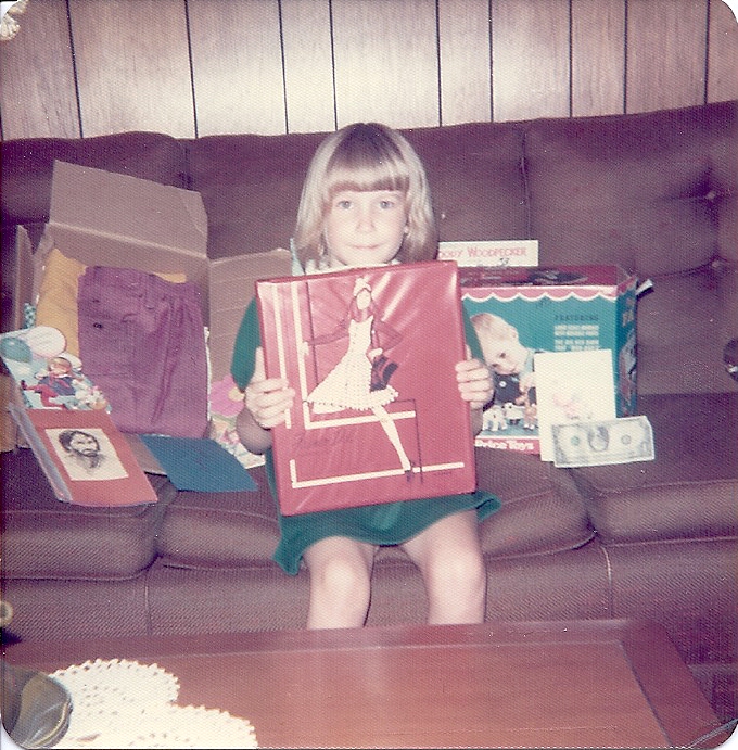 | Here I am with my Barbie doll case and behind me is my much cherished farm! There would be no possible way to count how many times that farm door said, “Moo!” |