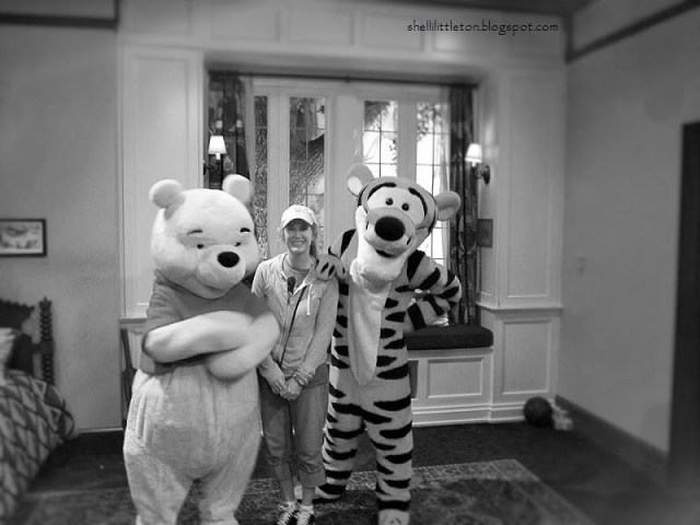 | Pooh, me, and Tigger (hee, hee!) at the end of a very long day. The best thing about this photo … I didn’t have to wait in line, deal with the rain or the wind! |