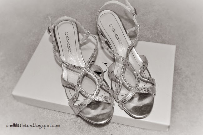 We found the sweetest sparkly, diamond type shoes with a small heel. More than $50.