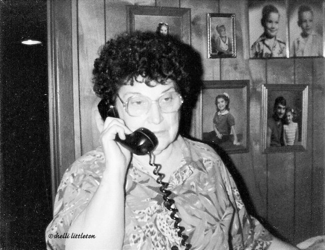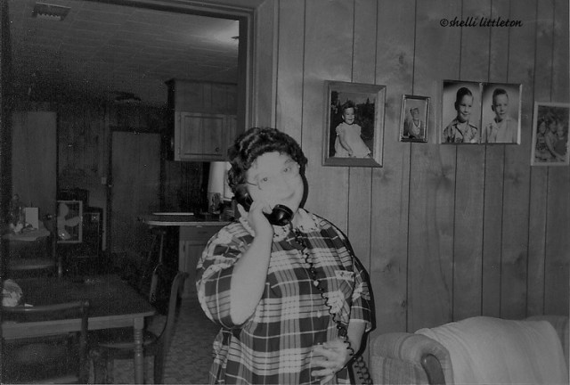 My grandmother possibly dealing with her party-line–complete distractions. And I’m in the fourth picture to the right of her–my two siblings and me, with me in the middle.  My dad is in the picture to the left of me, and my uncle beside him. This house burned, and I miss it so much. Do you see the far bar with bar stools behind it? I spent many a day pretending to drive with those bar stools. And that’s where I ate most every meal visiting there, as a kid.