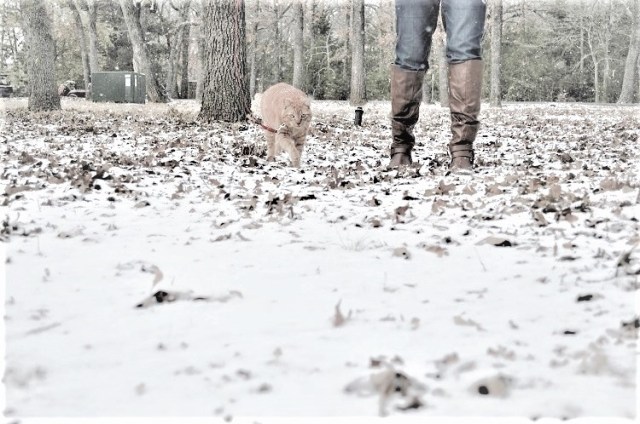 My daughter picks up the cat, opens the front door, steps her new boots out into the snow.
