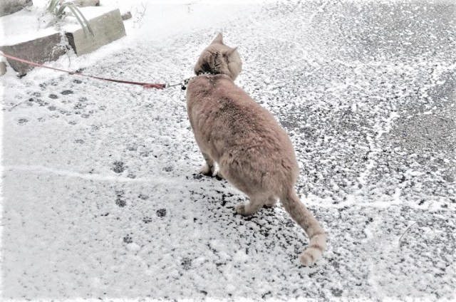 She sets Azzie down into the snow. He leaves a trail of paw prints.