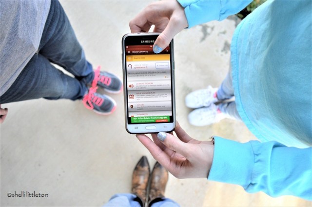 We plop down onto the floor, circle around, maybe hit the couch, maybe climb into my bed …. She takes my phone, hits the Bible Gateway App.
