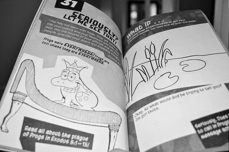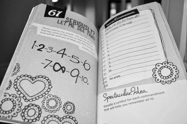All 90 devotions are different and action packed. Some contain pictures to color, fill in the blanks, uniquely crafted drawing spaces for certain topics, questions asked to answer and think on … basically, a chance to doodle and meditate on God. Kids love to color … never seem to outgrow it … and I think this is a sweet way to combine learning about God with one of their favorite activitiescoloring/drawing.
